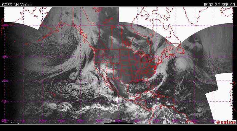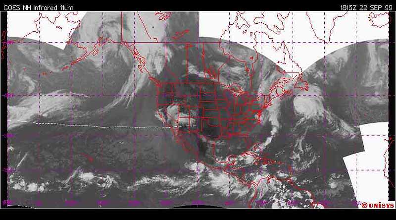 Note Picture 1. This is the GOES 10 and 8 mosaic of the Hemisphere for 1815 Zulu, Sept 22, 1999. Note just above 30 degrees north you will see a series of white dots that come out of the terminator near southeast asia, and the dots continue eastward along a wavy line that centers on 33 degrees north and end in central New Mexico. This is the visible light spectrum.