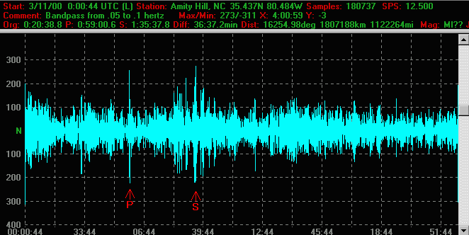 Kent: This graph shows a data capture of a ULF event which began at 00:59UT on 03/11/00. The disturbance was quite intense and the time corresponds with the Arkansas event on Friday night. The center frequency of the wave is .08 hertz.