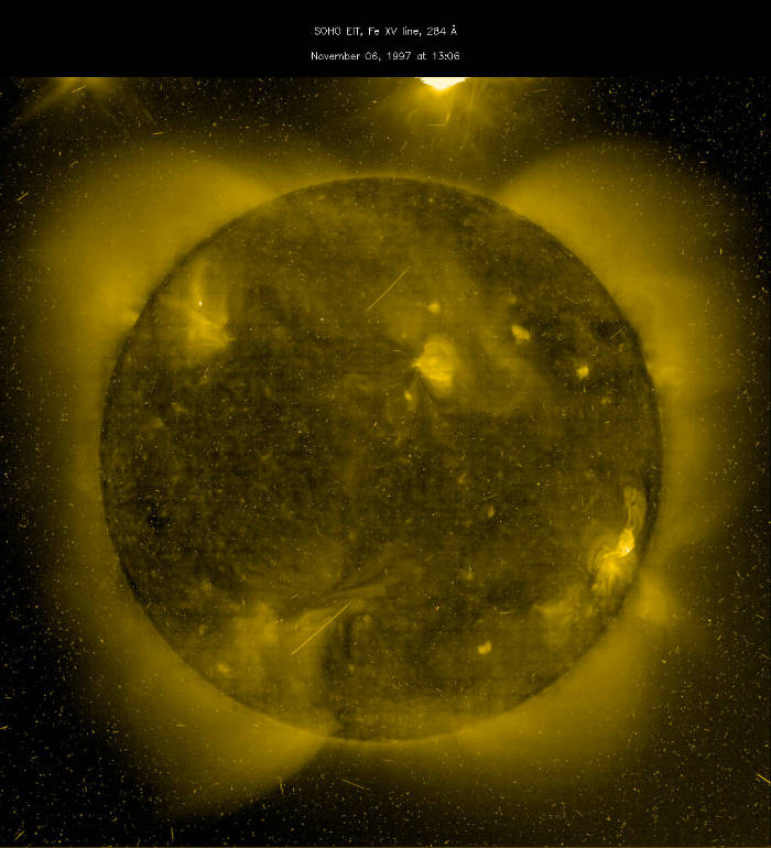 Hi. I have found a Hi Res color image of EIT 284 from 1997/11/06. It also has that glowing mass above it as on the image from 1997/11/06 01:06:20. the picture you guys gave "the Wierd Award" to. Hope it helps.